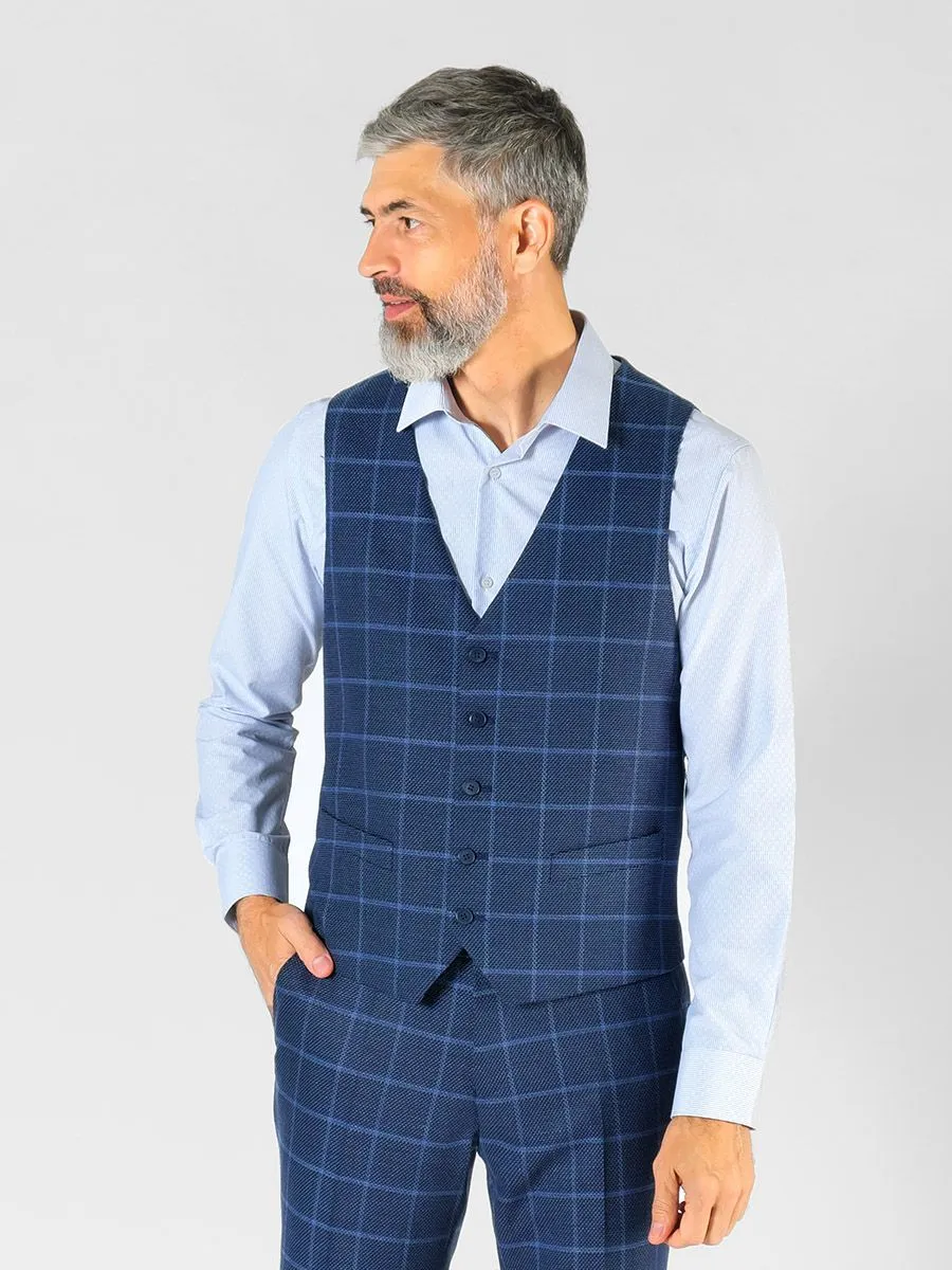 Классический жилет наилучшим образом выступает в тендеме с костюмом SU23012-SL из такой же ткани. Образ можно сделать классическим строгим или более расслабленным и современным. Это зависит от того, будет надета сорочка или футболка, поло, а также какую длину брюк вы выберете. В любом случае жилетку можно использовать и в сочетании с однотонными брюками, только оттенок брюк нужно выбрать подходящий, ведь у ткани довольно сложный синий цвет с контрастной голубой клеткой. Спинка жилетки также сделана из основной ткани.