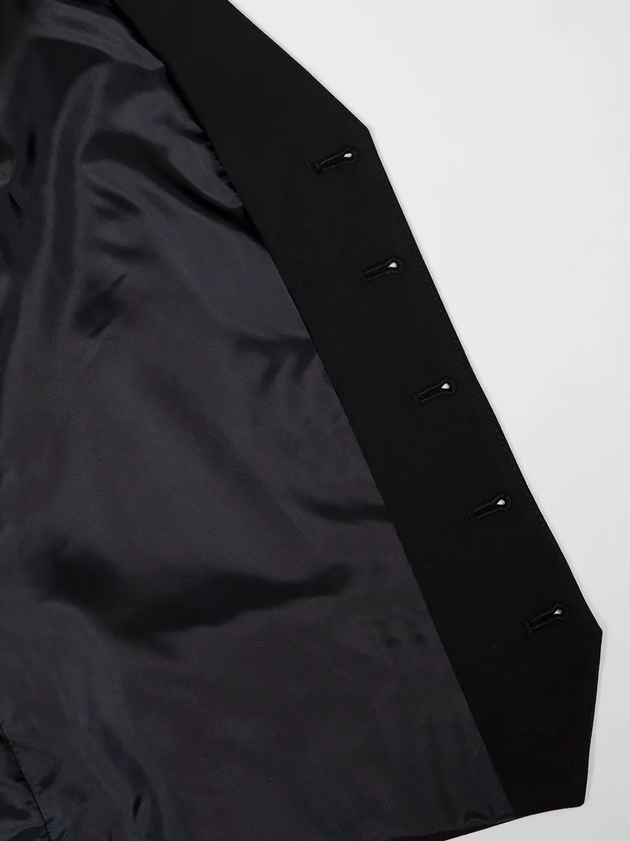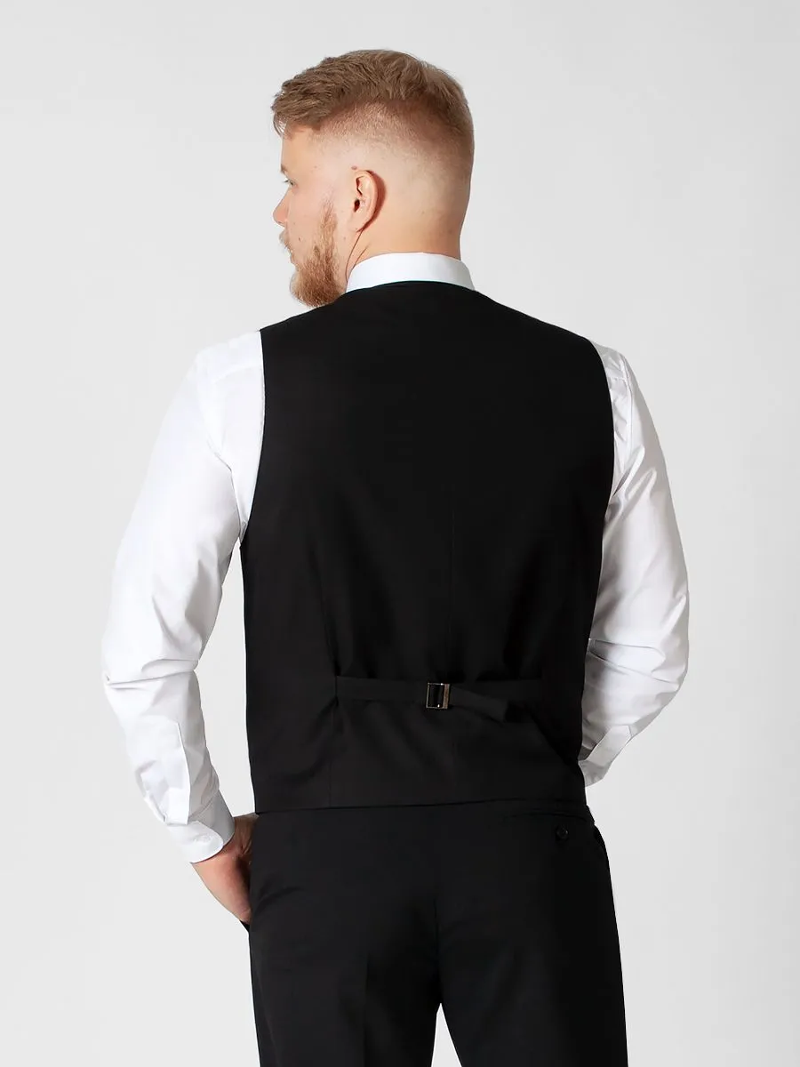Костюмный жилет Peplos черного цвета в сочетании с классическими брюками выглядит достаточно выдержано. Такой образ легко приспособить к повседневным делам. Но, если надеть жилет с темно-синими джинсами и базовой белой футболкой, то ансамбль получится стильным и простым в исполнении. Данная модель жилета является базовой и может хорошо гармонировать с классическими костюмами черного цвета. С жилетом будет легко создать костюм-тройку.
