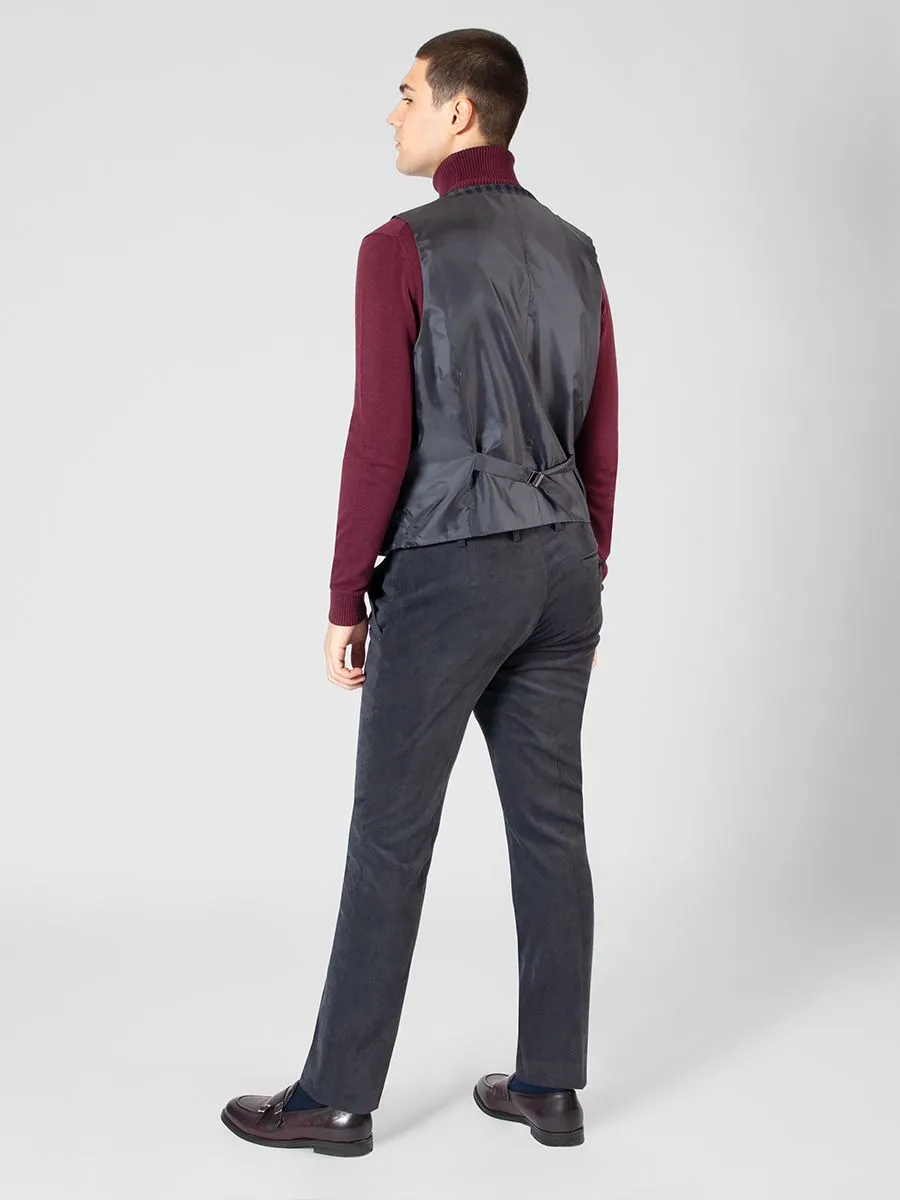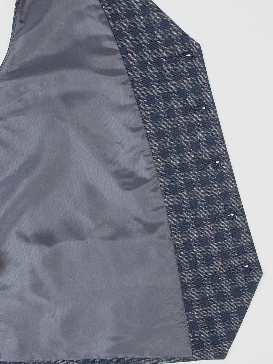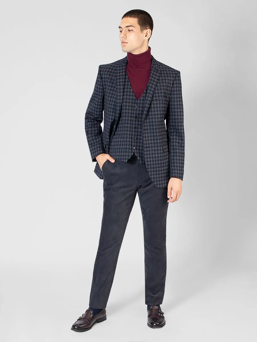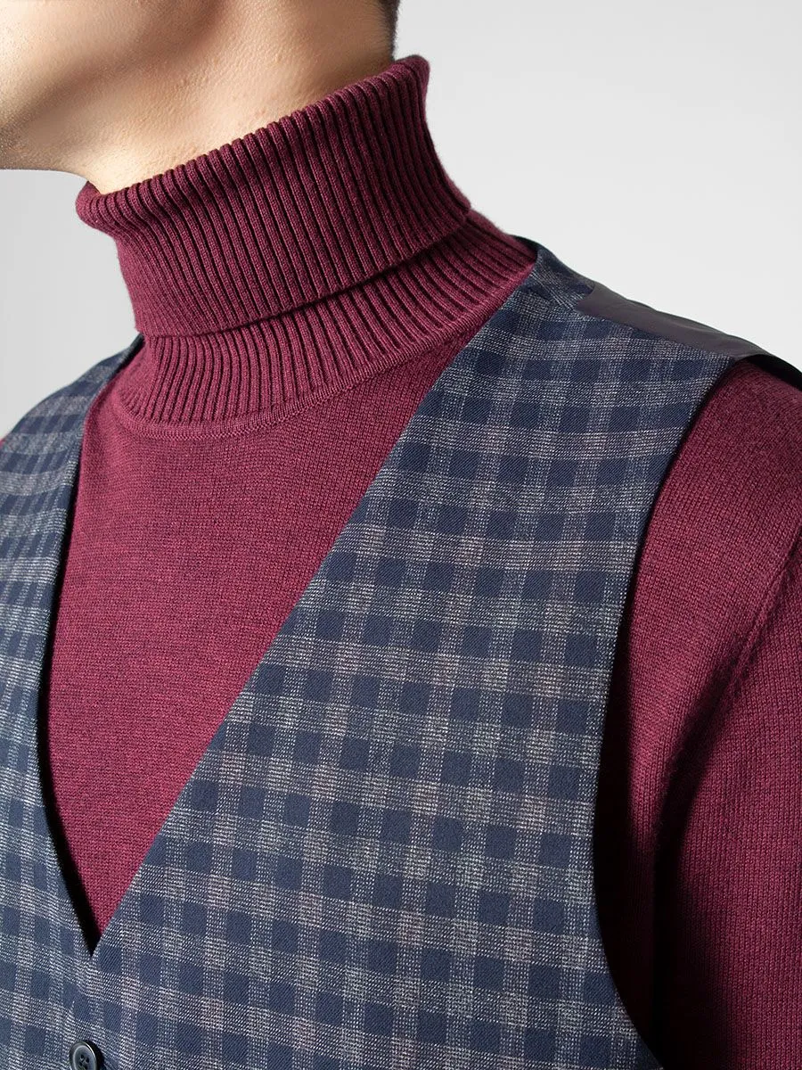 Мужская жилетка Peplos синего цвета выполнена в лаконичном стиле с темно-серой клеткой. Изделие имеет комфортный полуприлегающий силуэт, который сбалансирует как стройное, так и плотное телосложение. В составе содержится 2% спандекса, благодаря которому ткань имеет повышенному эластичность и прочность. В такой же ткани отшит мужской пиджак JA22019-SL. В образе присутствует бордовая водолазка KN22W005 и брюки TR22010-282