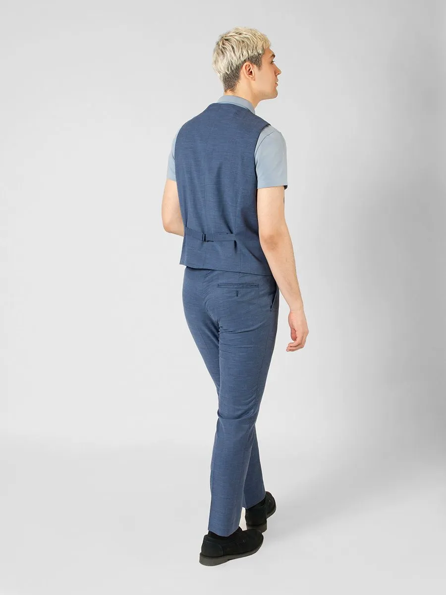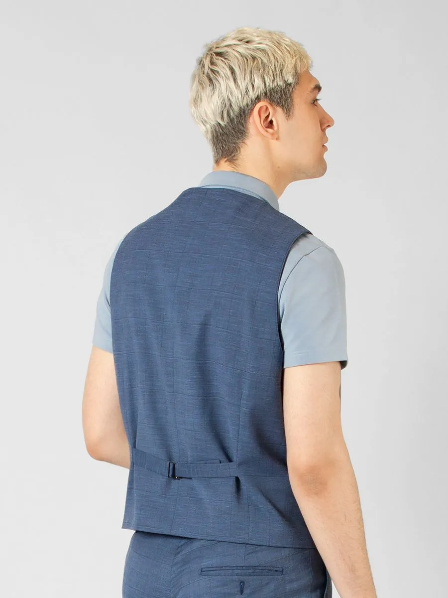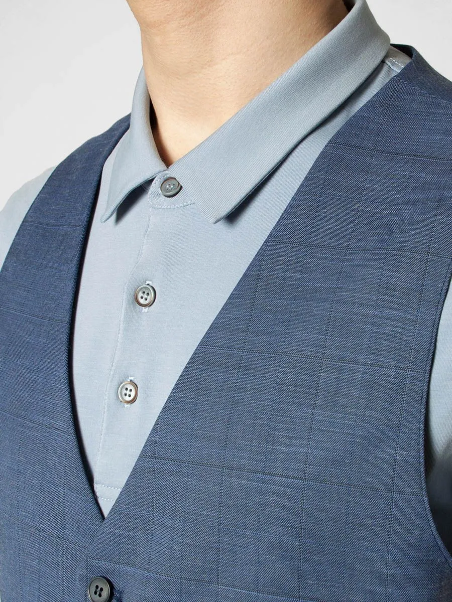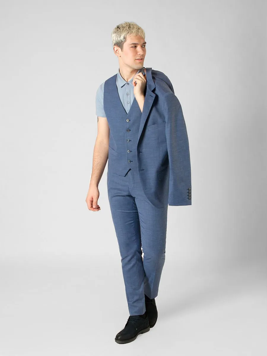 Жилет светло-синего цвета выполнен из ткани с содержанием льна, что заметно по ее фактуре. Жилет отлично дополняет костюм SU22043-SL, ведь он сделан из той же ткани. Спинка жилета также выполнена из основной ткани, имеется хлястик. Жилет подходит для создания более сложных образов на торжественные события и важные мероприятия.