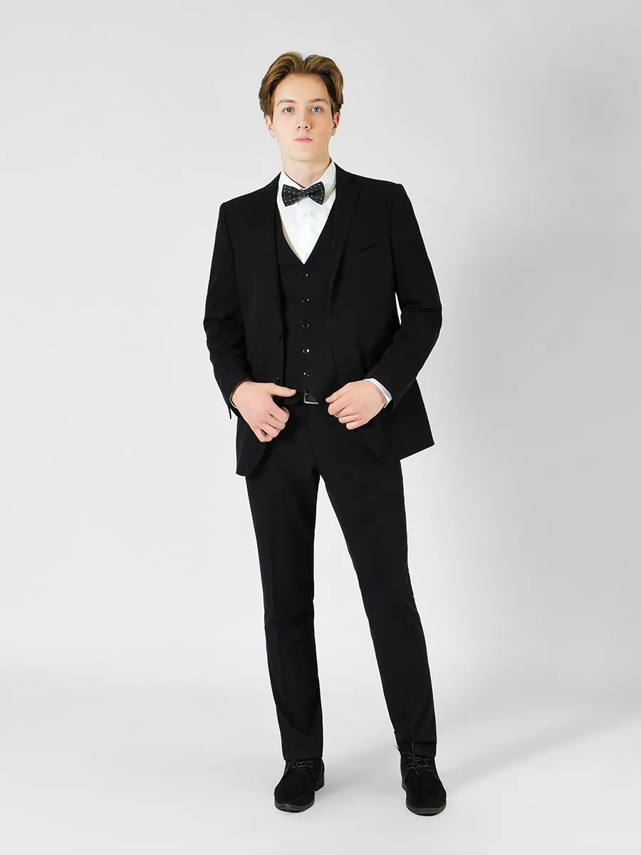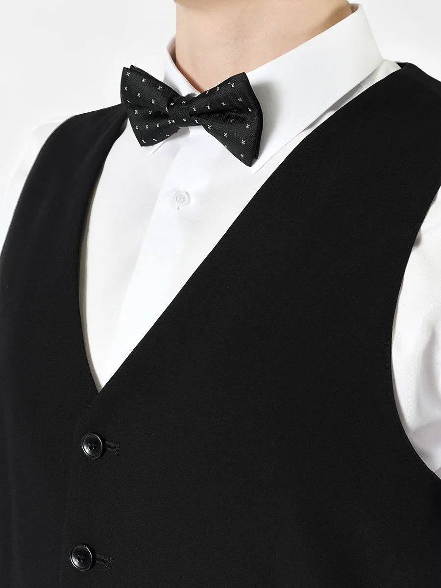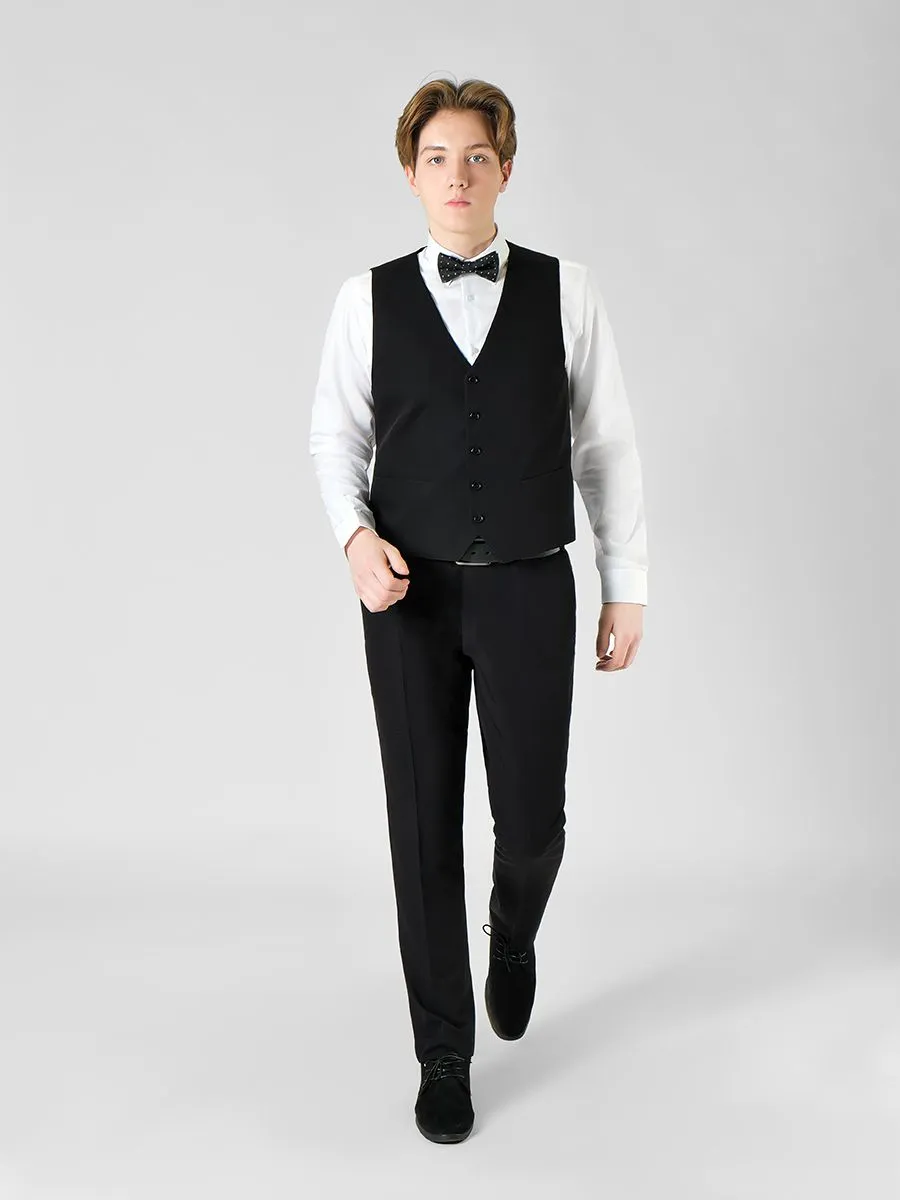 Черный жилет выполнен в классической модели, спинка жилета изготовлена из основной ткани, внутри прошит подклад. Спереди жилет застегивается на пять пуговиц, сзади имеется хлястик для регулировки объема по талии. Жилет может стать отличным дополнением к костюму SU23099-SL.