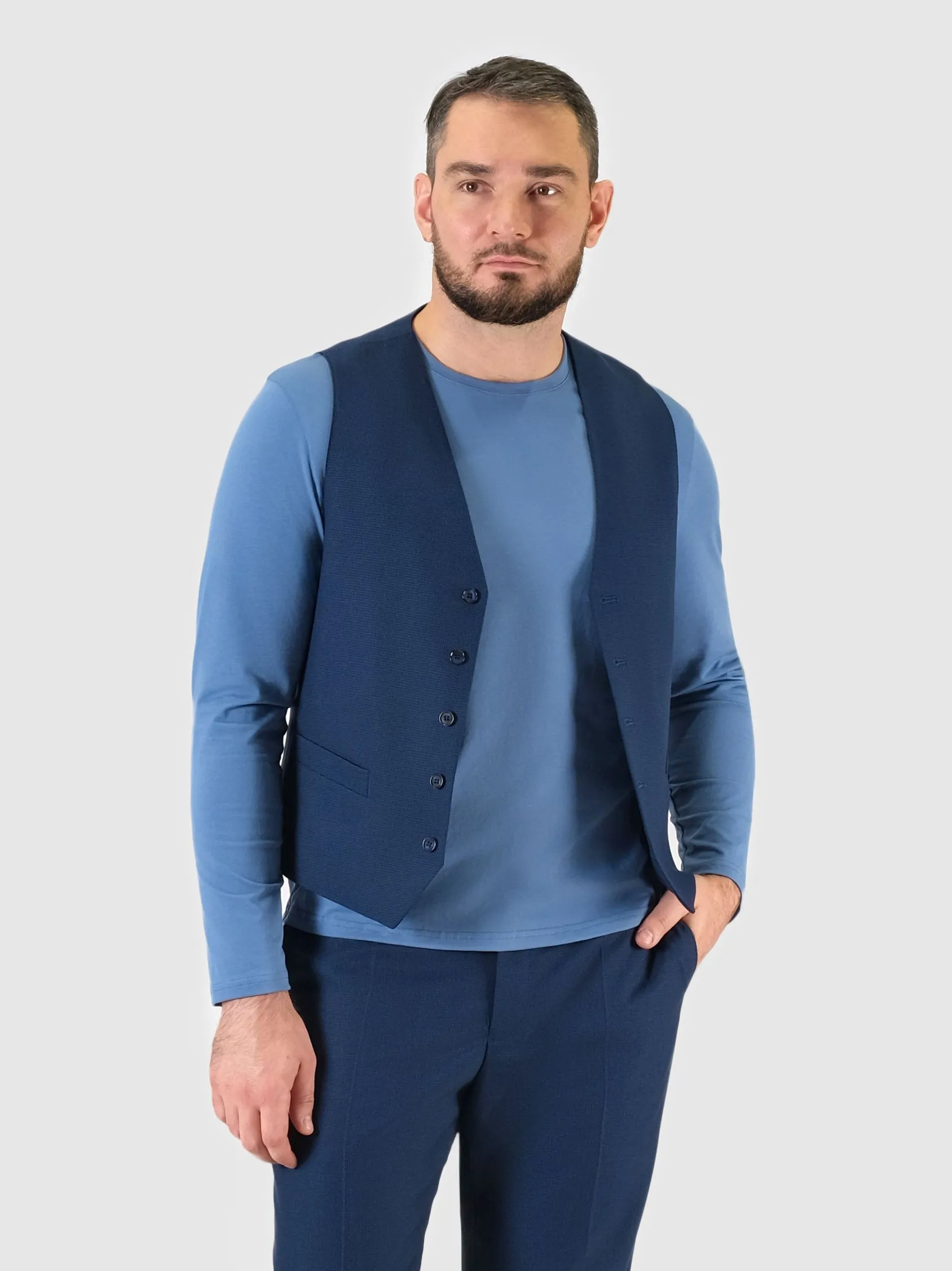 Жилет темно-синего цвета с некотрастным узором в виде мелкой клетки. Жилет создает элегантную пару с брюками TR24002-234. Модель исполнена в полуприлегающем силуэте, так же имеется хлястик для регулировки объема по талии.Спинка изделия изготовлена из основной ткани. Внутри изделия прошит подклад.