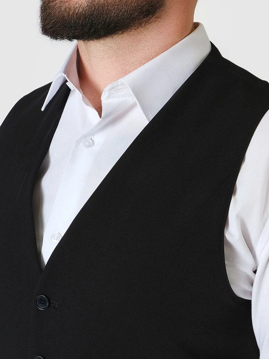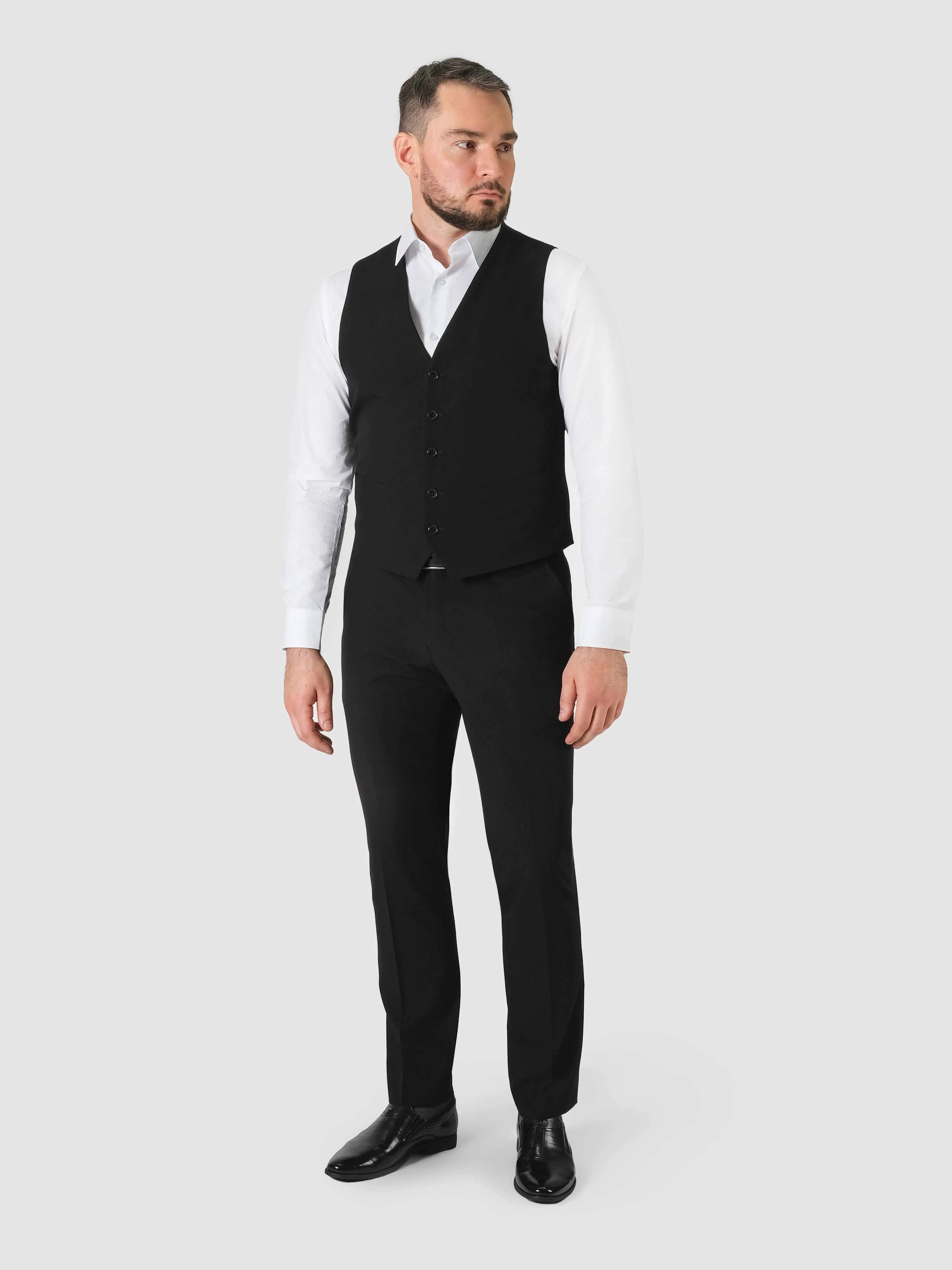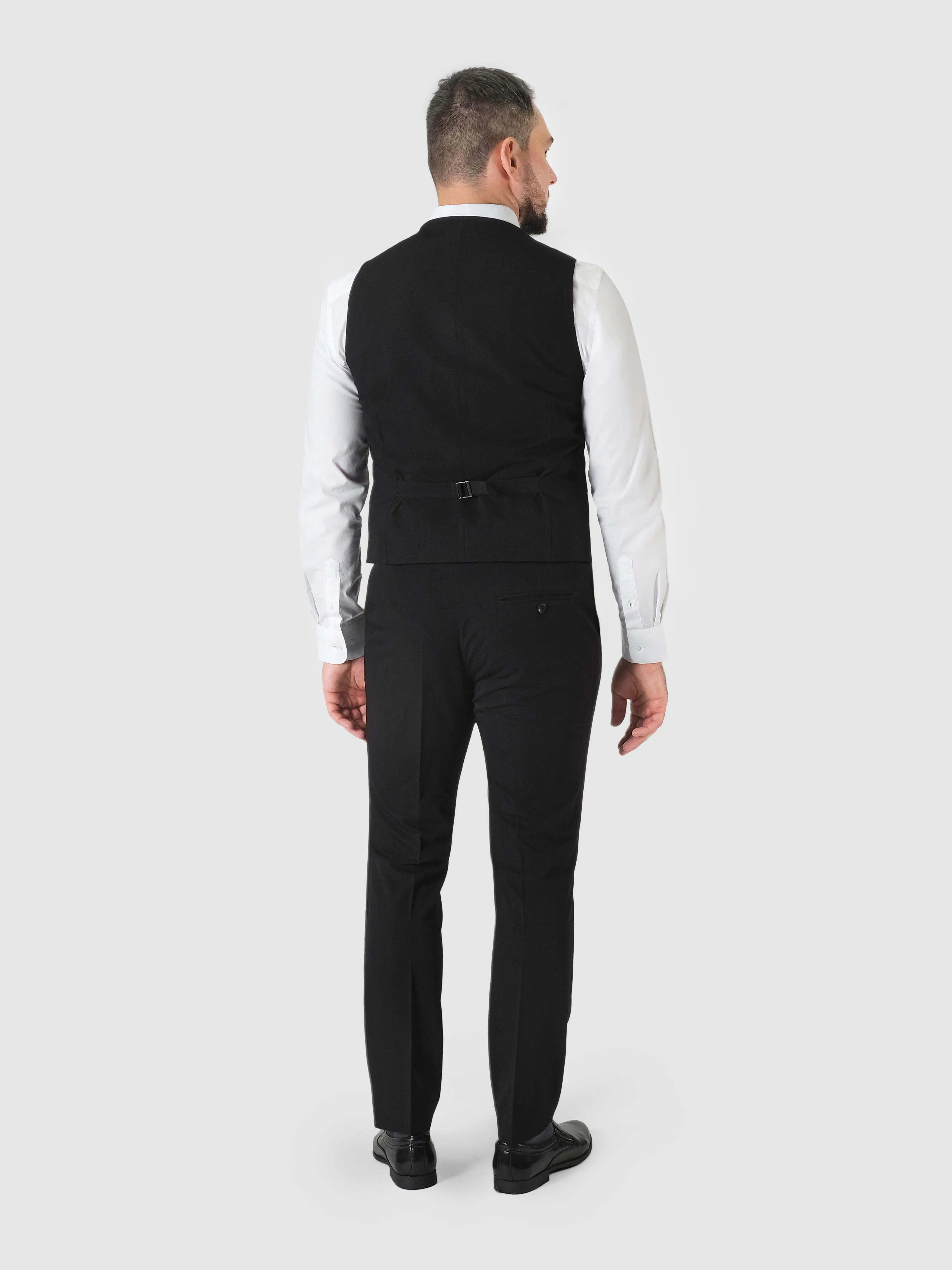 Черный жилет Peplos выполнен в полуприлигающем силуэте, спинка жилета изготовлена из основной ткани, внутри есть подклад из 100% полиэстера. У жилета имеется хлястик для регулировки объема по талии, спереди изделие застегивается на пуговицы. Материал имеет в составе спандекс 4% , что дает комфорт в движении и носке. Жилет может стать отличным дополнением к брюкам TR24099-282.