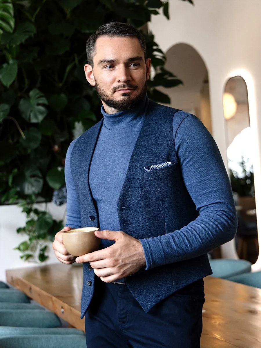 Новый тренд этого сезона- трикотажный мужской жилет. Такой жилет сделает любой образ более элегантным и деловым, при этом сохраняя мягкость и комфорт трикотажного изделия. Жилет будет одинаково хорошо смотреться с классическими брюками и с чиносами. Ткань жилета обладает приятным синим цветом и оригинальным микродизайном. Застегивается жилет на 5 пуговиц, а сзади есть хлястик для регулировки объема.