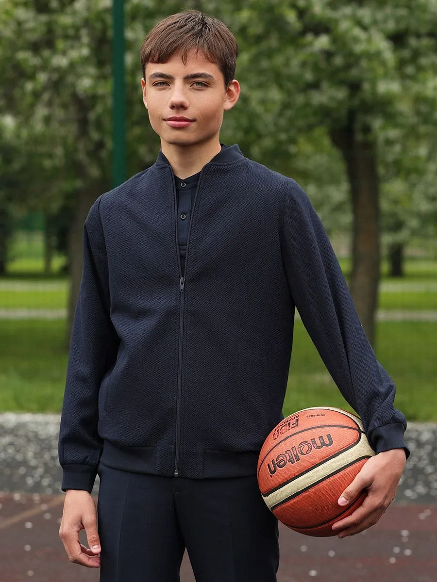 Бомбер, выполненный из костюмной ткани глубокого темно-синего оттенка, являет собой воплощение сдержанной элегантности, адаптированной для энергичного подросткового стиля. Ткань с микродизайном добавляет глубину и изысканность общему облику. Манжеты из эластичной резинки обеспечивают комфортную и надежную посадку, деликатно облегая запястья. Они не только функциональны, но и добавляют бомберу нотку спортивной небрежности, умело сочетающейся с классической строгостью костюмной ткани.Центральная застежка-молния, выполненная из прочного и надежного металла, обеспечивает легкость и удобство в использовании. Она плавно скользит, позволяя быстро и без усилий застегнуть или расстегнуть бомбер, адаптируясь к изменчивым погодным условиям и потребностям юного владельца.