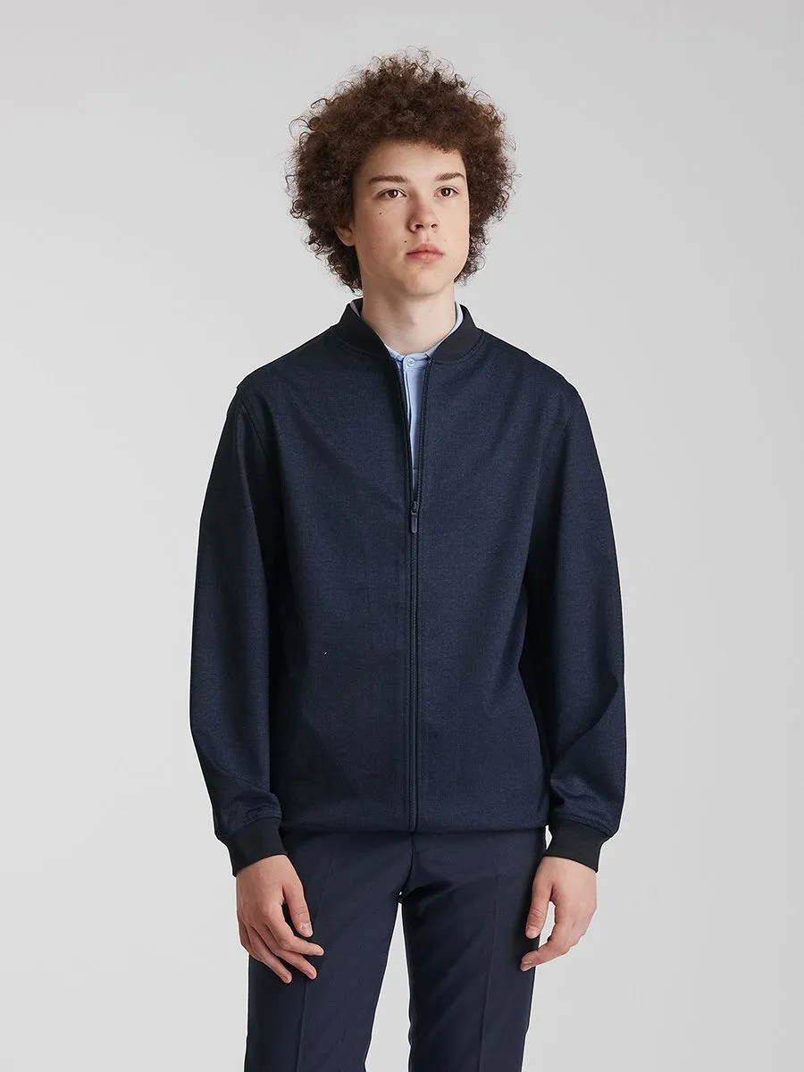 Для молодого человека, следящего за трендами, трикотажный бомбер станет отличным выбором. Этот бомбер, сшитый из меланжевой ткани темно-синего цвета, сочетает в себе удобство и подходит ко многим стилям. Благодаря интересной текстуре материал выглядит элегантно, что позволяет носить бомбер каждый день или надевать по особым случаям.