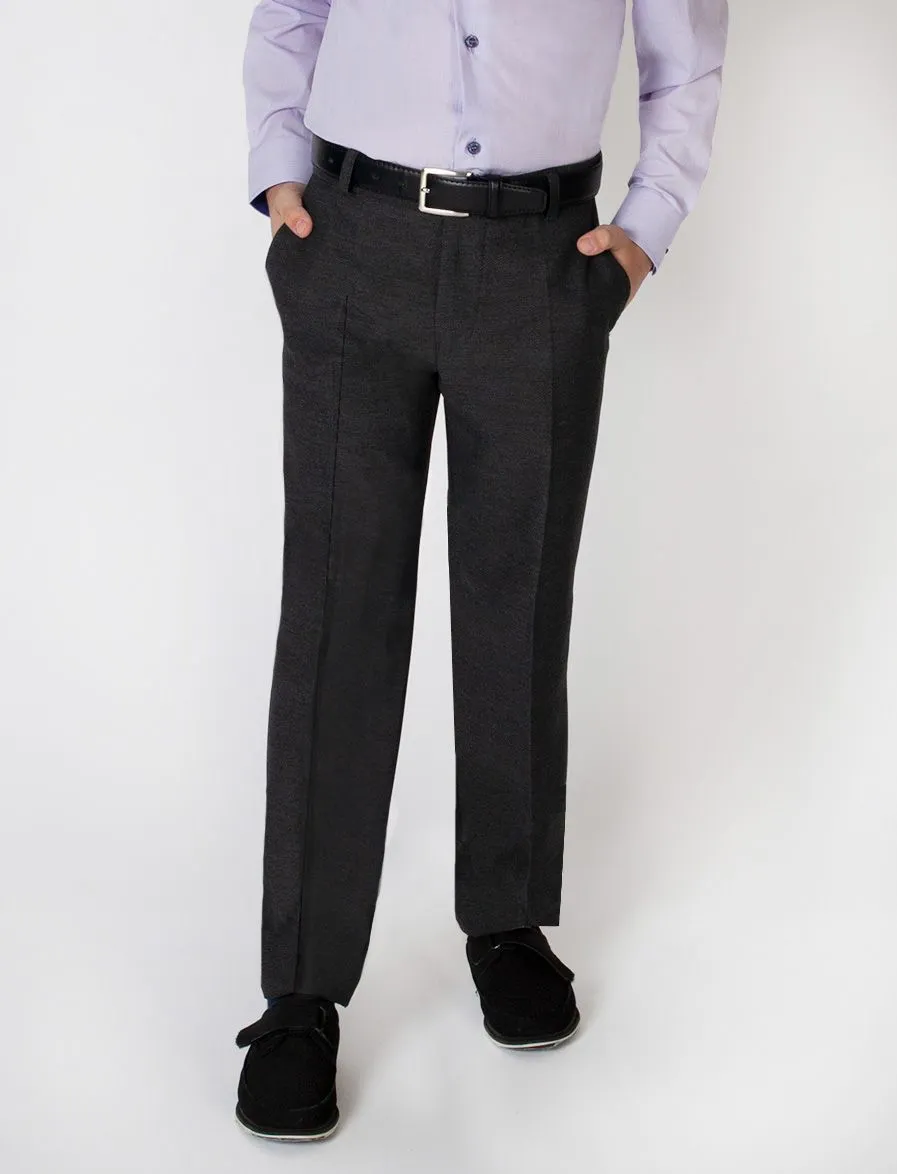 Строгие темно-серые брюки для мальчика школьного возраста идеально подойдут ребенку в возрасте 7-14 лет, став удачным дополнением детского гардероба. Модель имеет очень узкий крой брюк, а также шлевки для ремешка на поясе и боковые карманы. Фактурная ткань придает рельефности и объема изделию. В составе содержится 50% вискозы и 50% полиэстера. Брюки обладают устойчивостью к загрязнениям и не деформируется при носке.
