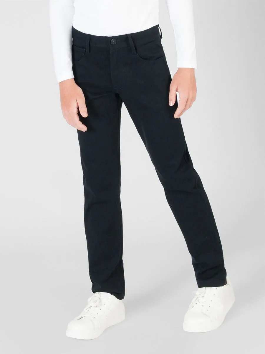 Хлопковые брюки для мальчика темно-синего цвета, почти черного, легко впишутся в повседневный гардероб ребенка. У брюк два глубоких передних кармана и два накладных задних. Силуэт брюк слегка заужен, поэтому остается место для нескованных и комфортных движений.