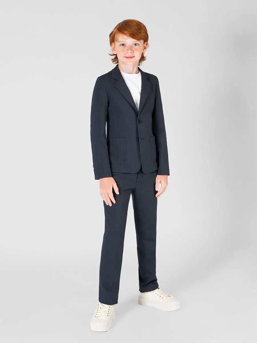 Трикотажный костюм для мальчика будет актуален во многих случаях. Трикотаж комфортней в носке в отличие от классического костюма, благодаря хорошей эластичности и мягкости. Поэтому такой костюм можно смело носить весь день и заниматься различными активностями. У пиджака приталенный силуэт с двумя накладными карманами, подклада нет. Брюки имеют зауженный силуэт и два удобных боковых кармана. Сине-серая хлопковая ткань с микродизайном выглядит интересно, а главное, немаркая и универсальная.