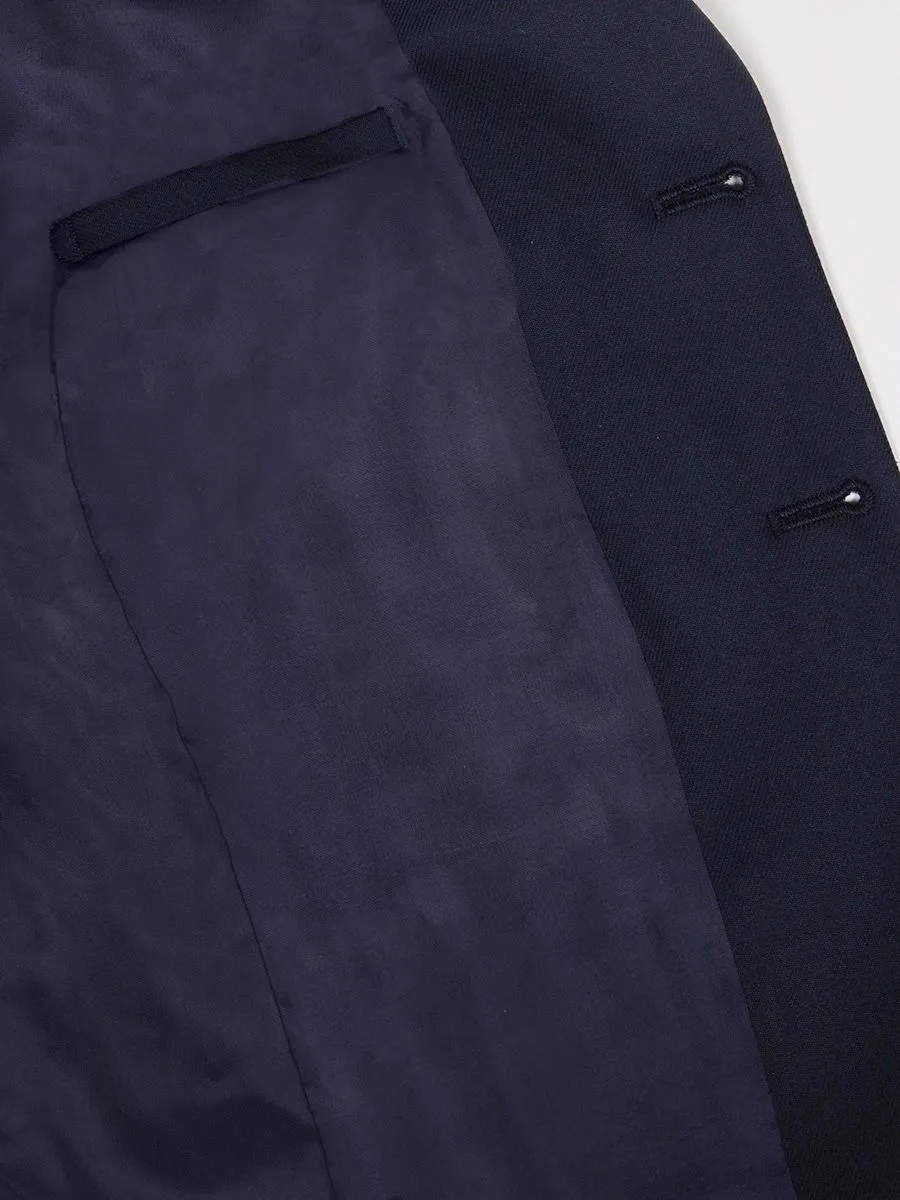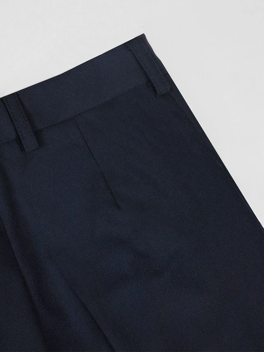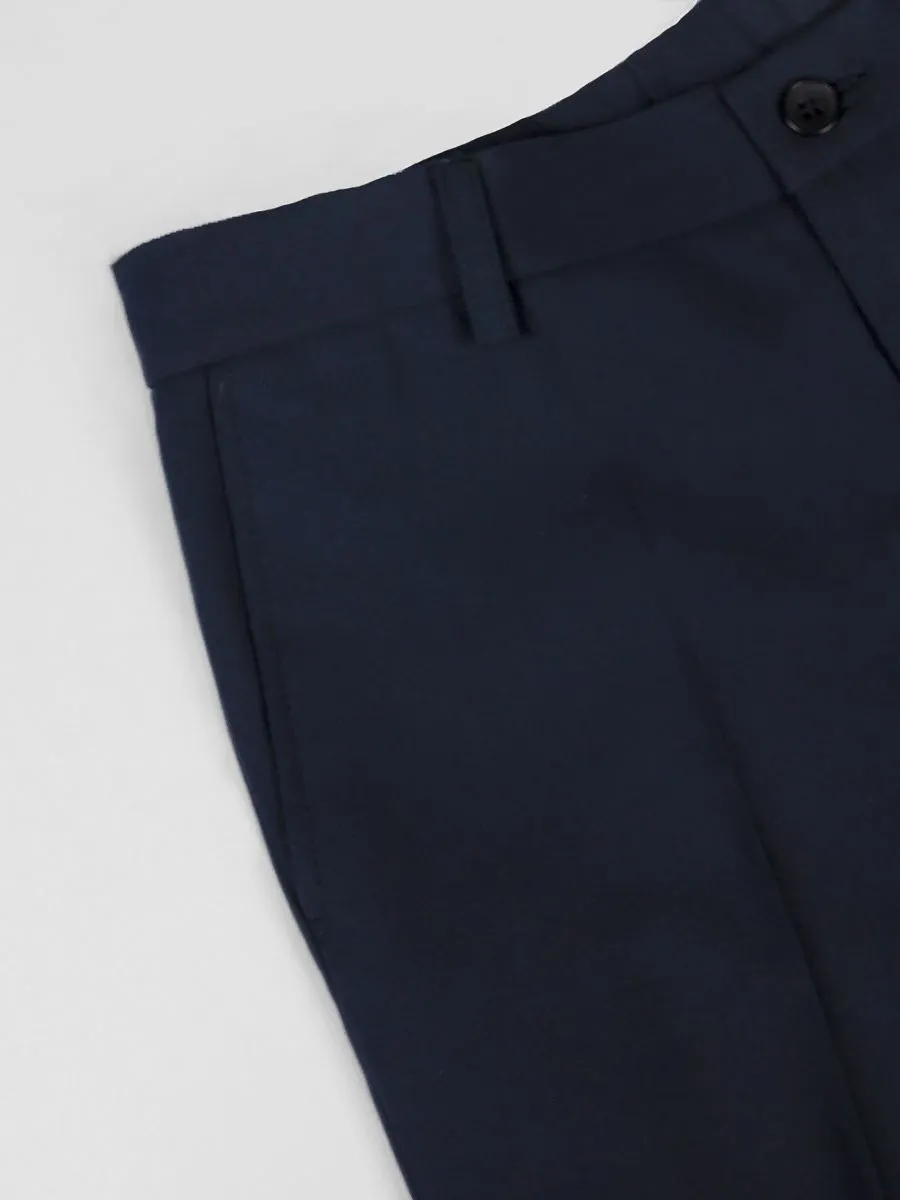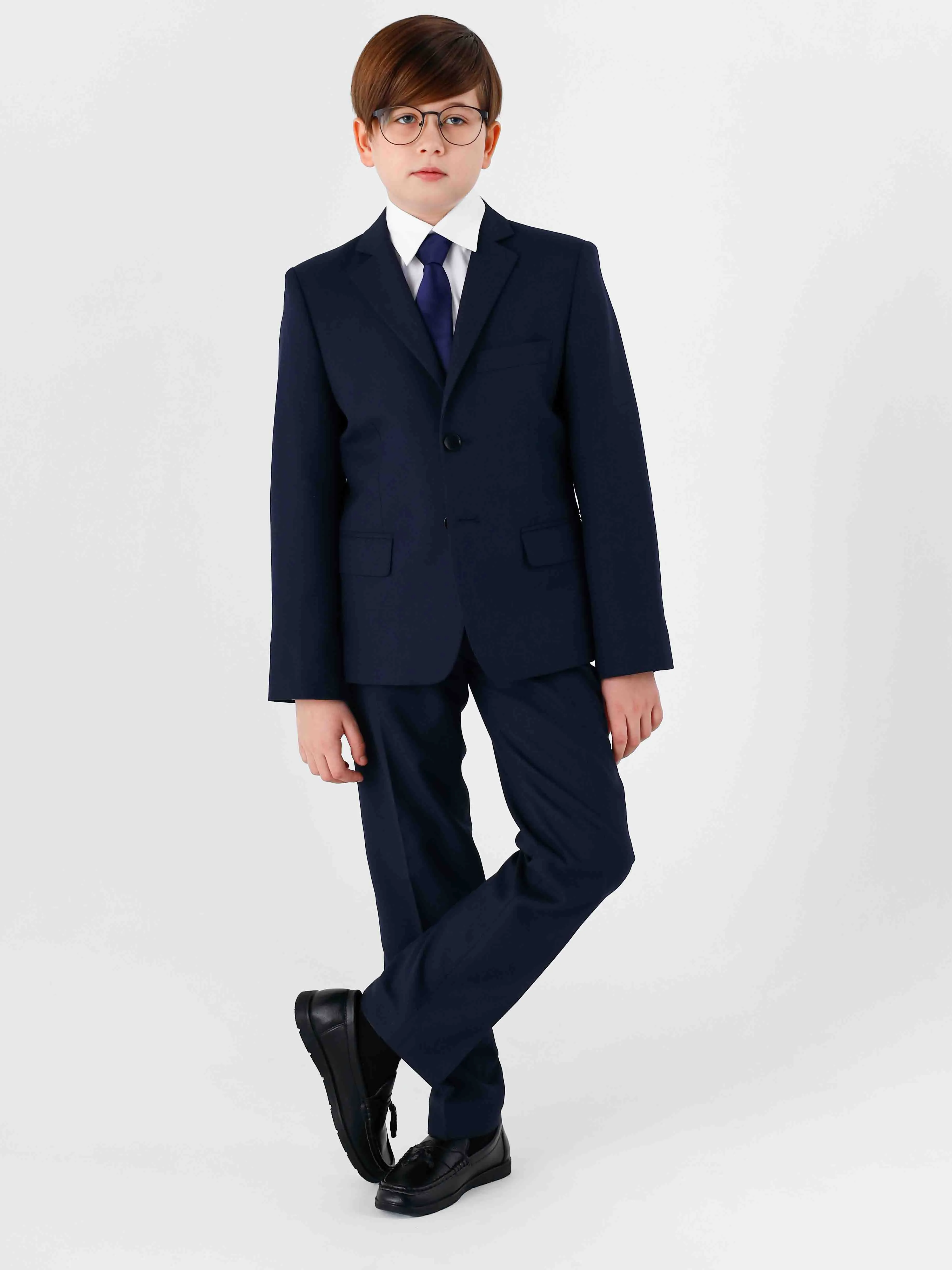 Традиционный синий костюм для мальчика, выполненный в прямом силуэте, служит превосходным вариантом для школьных мероприятий.