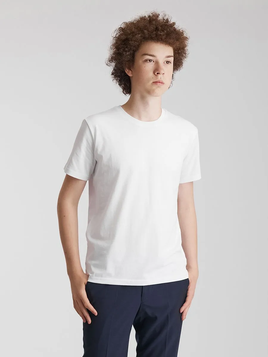 Простая белая футболка является незаменимой вещью в гардеробе подростка. Она всегда будет уместна. Эта футболка отлично подходит для занятий спортом благодаря добавлению лайкры, которая обеспечивает необходимую эластичность. Ее можно носить в школу, надев под пиджак или трикотажный кардиган, так как основным материалом является натуральный хлопок, а также носить на различные развлекательные мероприятия. Белый цвет универсален, выглядит свежо и чисто, но быстро пачкается, поэтому рекомендуется иметь запасную белую футболку.