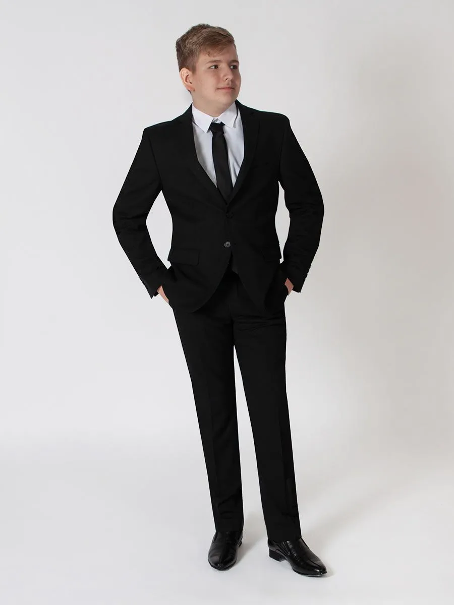 Костюм подростковый Peplos для мальчика выполнен в строгом чёрном цвете. Приталенный силуэт позволяет изделию сесть строго по фигуре, но при этом не лишать ребенка свободы для движения. В этом костюме подросток будет выглядеть стильно, модно и нарядно. Пиджак имеет два врезных внутренних кармашка, подклад с шелковистой фактурой из 100% полиэстера. Классические брюки со стрелками повторяют контуры ног и делают их более выразительными. Основной состав изделия — поливискоза.