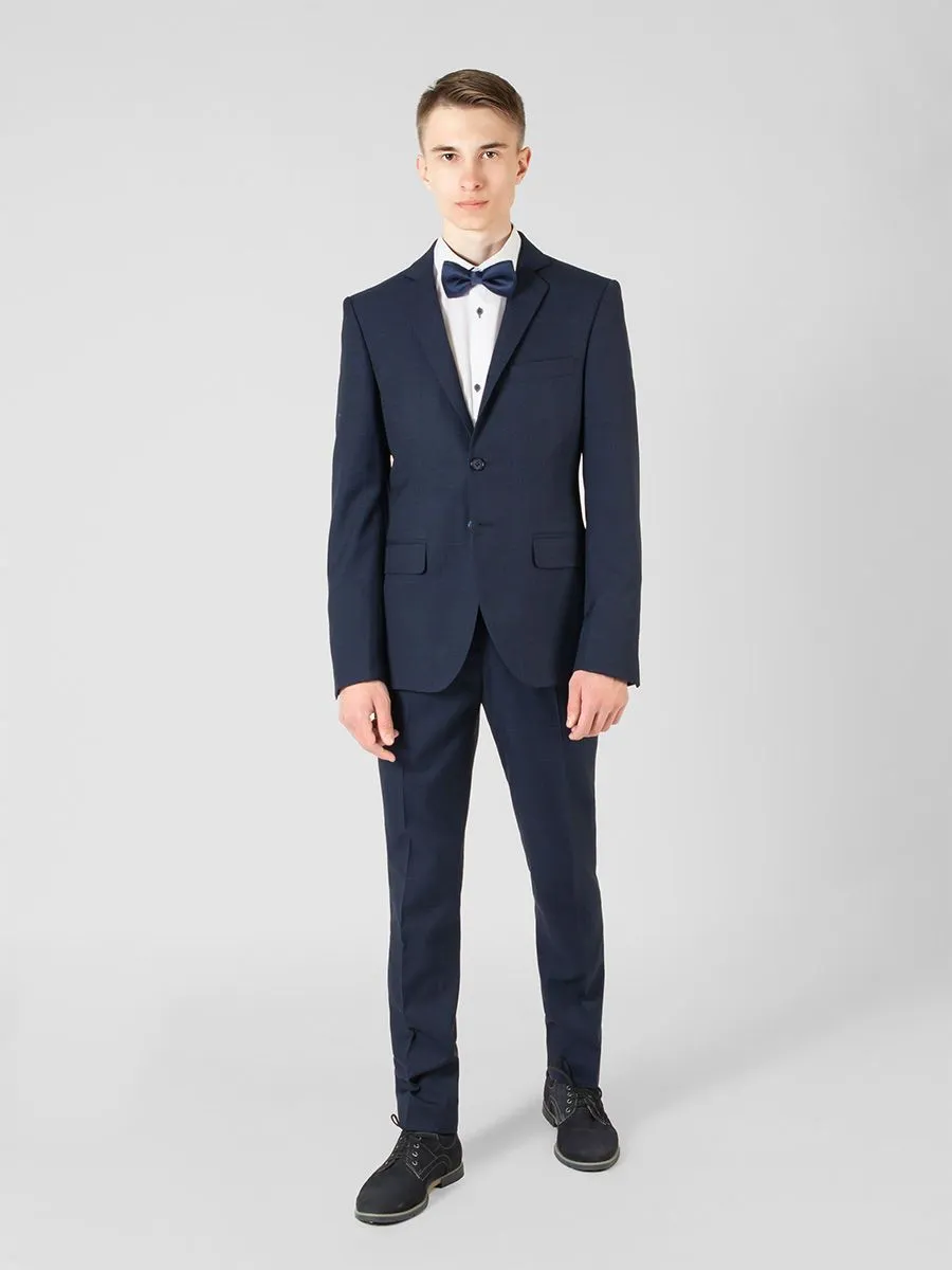 Костюм Peplos создан специально для высоких и стройных подростков. Размерный ряд рассчитан вплоть до 194 ростовки. У костюма темно-синий цвет с неяркой крупной клеткой. Костюм очень практичен, на нем малозаметны следы пыли или грязи, что актуально для детей и подростков.