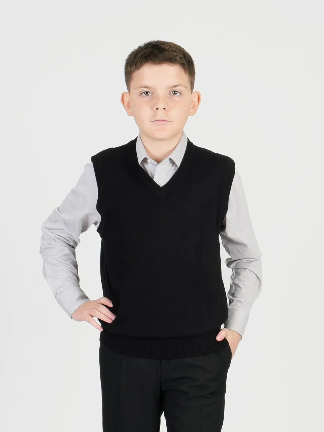 Этот черный жилет для мальчика — не просто предмет одежды, а символ удобства и модного образа. Сшитый из 100% хлопка, он станет незаменимой составляющей повседневного гардероба подростка. Натуральная ткань предлагает отличную воздухопроницаемость и лёгкость, что очень важно для активных молодых людей.Изделие выполнено гладкой вязкой без узоров, что делает его лаконичным и универсальным. Однотонная фактура позволяет легко комбинировать жилет с другими предметами гардероба: будь то школьная рубашка или яркая футболка для прогулок с друзьями. Простой крой и отсутствие лишних деталей делают акцент на качестве и удобстве.