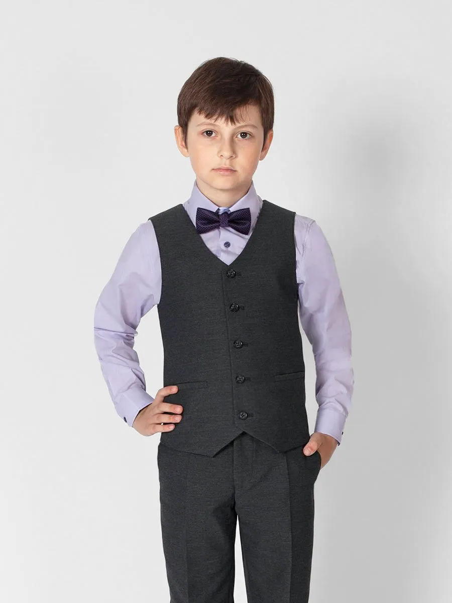Темно-серый жилет Peplos для мальчика будет хорошо сочетаться с брюками такого же серого оттенка. Фактура ткани имеет легкую рельефность, которая преображает данную модель и делает её более привлекательной. В состав входят 50% полиэстера и 50% вискозы, поэтому изделие достаточно прочное приятное на ощупь. Чтобы использовать этот жилет для праздничных и торжественных мероприятий, его можно дополнить сиреневой сорочкой и бабочкой темно-фиолетовых оттенков. Ткань: 78425 цв. 0.9 Вискоза: 50%, Полиэстер: 50%.