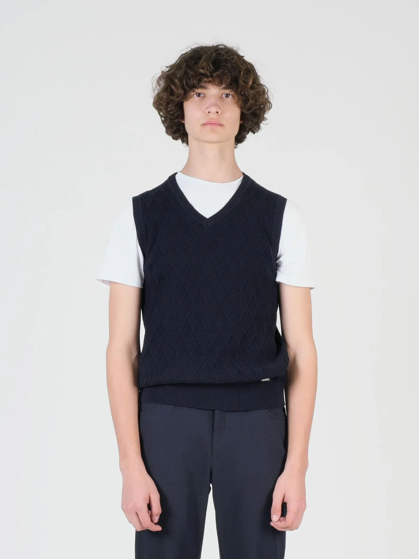 Трикотажный жилет в темно-синем тоне для подростков выполнен из 100% хлопка, который гарантирует высокую степень комфорта при носке. На передней части присутствует утонченный жаккардовый узор, добавляющий жилету стильный и элегантный штрих. Благодаря мягкой текстуре ткани, жилет приятен к телу идеально сидит на любой фигуре. Сочетание современного дизайна и качественного материала делает этот жилет прекрасным дополнением к гардеробу вашего ребенка, подходящим как для повседневного использования, так и для особых случаев.