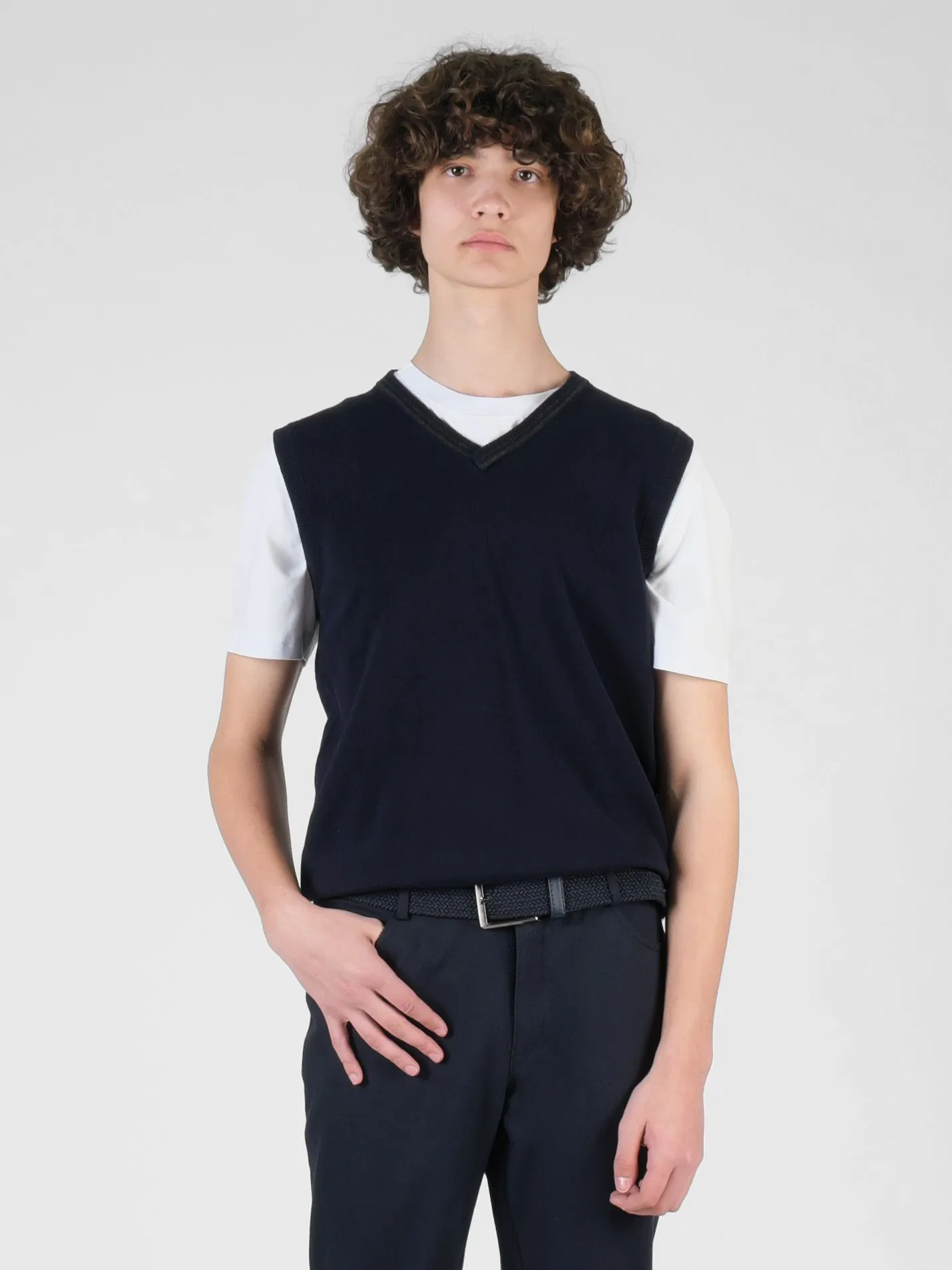 Темно-синий трикотажный жилет для подростка смотрится утонченно и элегантно. Его особенность — изящные серые полоски на воротнике, которые привлекают внимание и придают жилету выразительность. Вязка гладью делает изделие ровным и аккуратным на вид. Этот универсальный жилет подходит для любых ситуаций: от школьных будней до прогулок и семейных мероприятий. Благодаря простому и лаконичному дизайну, его легко сочетать с сорочками, водолазками и футболками, что позволяет создавать разнообразные и стильные образы.